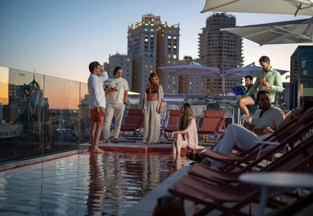 Hotel moderno situado a pocos pasos de la Gran Vía, diseñado para disfrutar de Madrid desde las alturas. Su gran protagonista es el rooftop con piscina infinity, un espacio exclusivo con tumbonas, vistas al skyline y ambiente relajado ideal para desconectar en pleno centro. Un lugar perfecto para refrescarse, tomar algo y vivir una experiencia urbana única mientras disfrutas de uno de los rooftops más especiales de la ciudad.